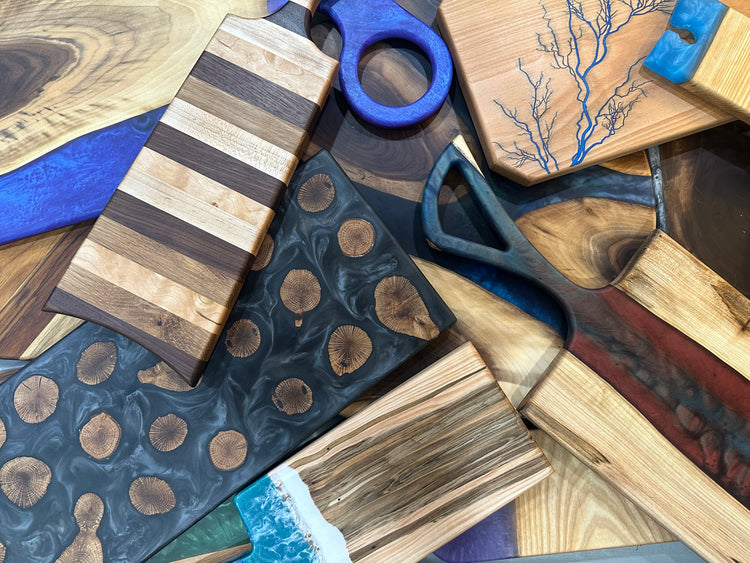 Browse our available charcuterie boards and serving trays! All of these products are made with food-safe epoxy and finished with a food-safe mineral oil and wax. They are sold as pictured.